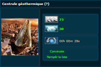 La centrale géothermique, avec vos mines, est le ciment de votre empire. Elle est la première façon de produire de l'énergie pour votre empire, après les satellites solaires. Vous pourrez utiliser aussi la centrale de fusion, mais elle est consommatrice en azote.
