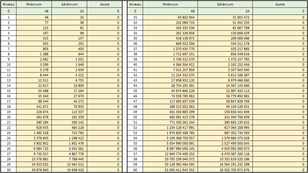 Coût Rhénium ou Sélénium: (coût au niveau 1)*1.6^(n-1) avec “n” niveau souhaité.