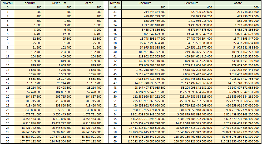 Coût Rhénium, Sélénium et Azote : (coût au niveau 1)*2^(n-1) avec “n” niveau souhaité.