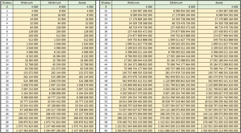 Coût Rhénium, Sélénium et Azote : (coût au niveau 1)*2^(n-1) avec “n” niveau souhaité.