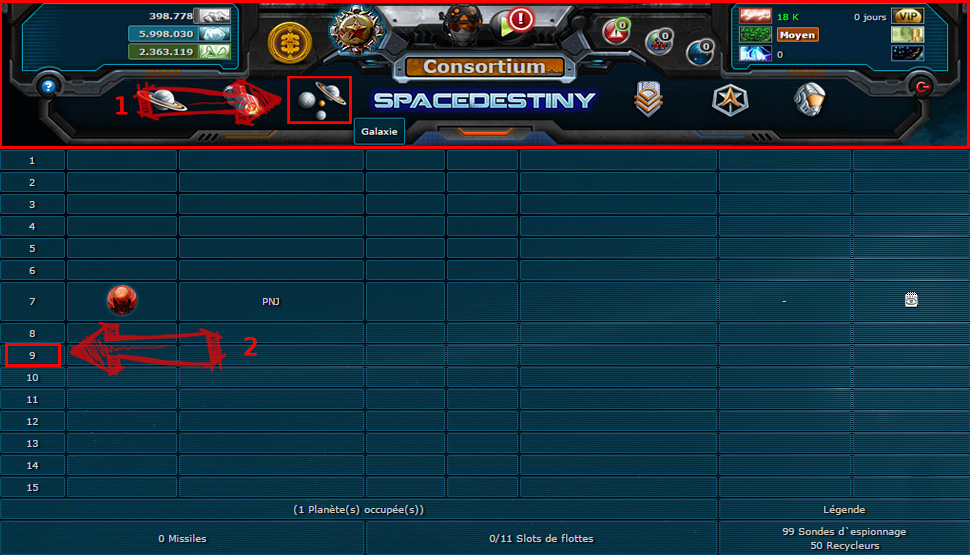 Une fois votre colonisateur construit, rendez-vous dans votre vue galaxie(1), puis choisissait l'emplacement de votre planète et cliquer(2) :