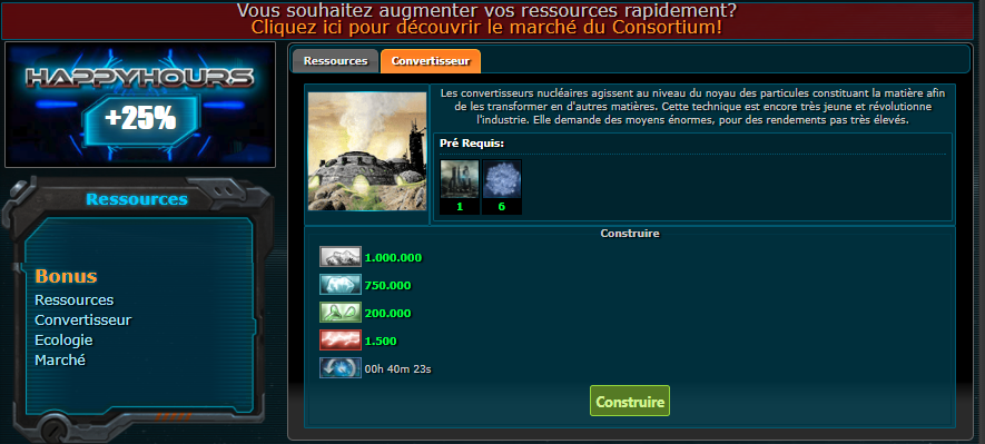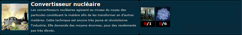 Afin de pouvoir commencer la conversion de matière, il vous développer votre convertisseur.. Vous aurez besoin de débloquer les prérequis : Usine de robots lvl 1 et Cristallographie lvl 6.