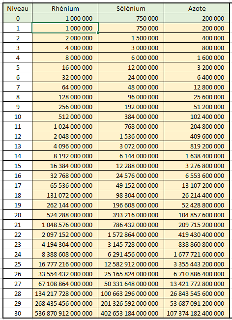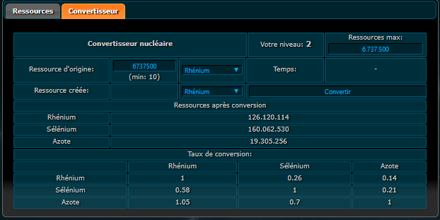 Pour produire une ressources, - sélectionnez la ressources d'origine, puis la quantité à utiliser - sélectionnez le type de ressource à créer - le convertisseur vous donne la quantité qui va alors pouvoir être produite en fonction des taux indiqués. - Si vous êtes d'accord avec les quantités obtenues, lancez la production en cliquant sur “Convertir”