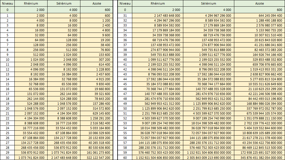 Coût Rhénium, Sélénium et Azote : (coût au niveau 1)*2^(n-1) avec “n” niveau souhaité.