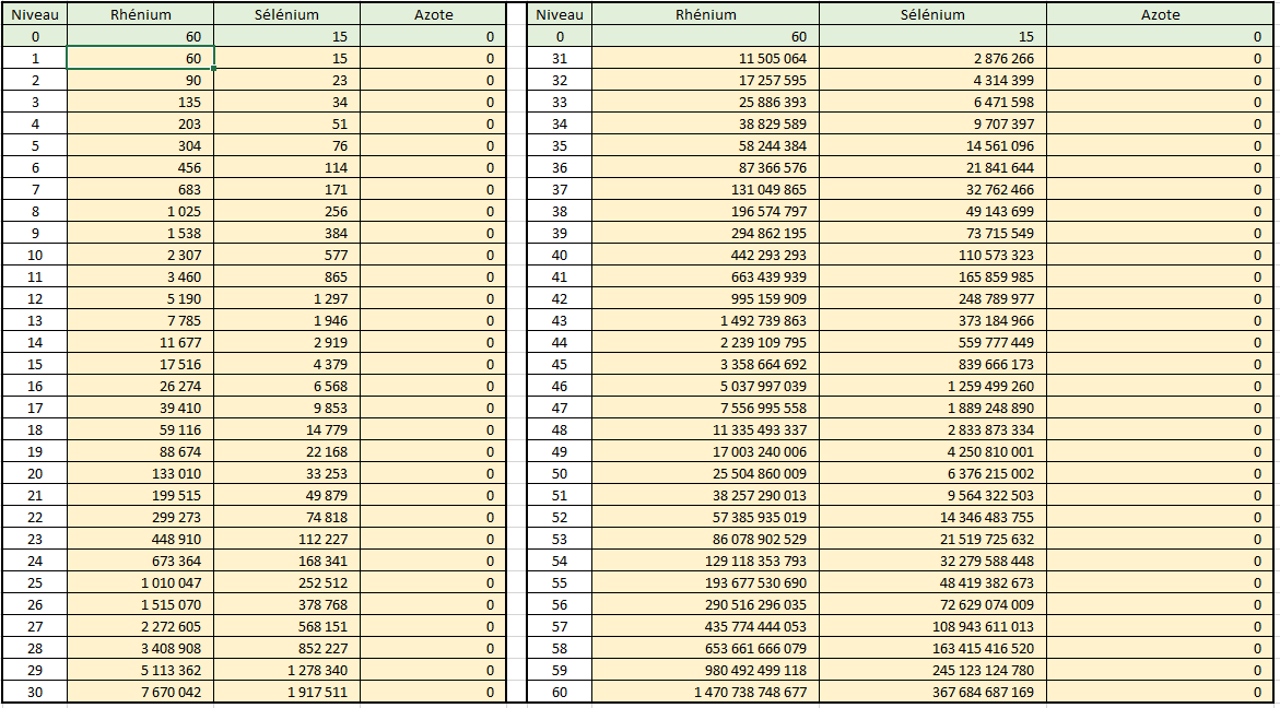 Coût Rhénium ou Sélénium: (coût au niveau 1)*1.5^(n-1) avec “n” niveau souhaité.