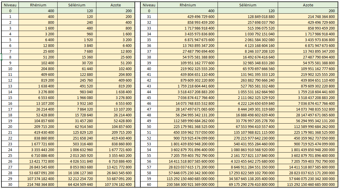 Coût Rhénium, Sélénium & Azote : (coût au niveau 1)*2^(n-1) avec “n” niveau souhaité.